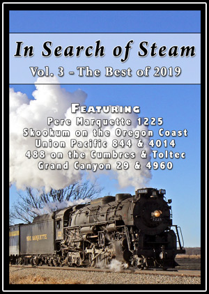 In 2019 the Union Pacific Railroad completed a multi-year restoration on 'Big Boy' locomotive #4014, and the inaugural run - The Great Race to Ogden - was undoubtedly the steam event of year. But apart from the Union Pacific steam program, there was little mainline action in 2019. Nevertheless, plenty of locomotives both big and small were still operating, and we traveled across the country once more "In Search of Steam" in order to film seven of them in action. This program begins in January with Pere Marquette 2-8-4 #1225 on a 2-day photo charter at the Steam Railroading Institute in Owosso, Michigan. While there was no snow on the ground it was below freezing the entire time, perfect conditions for some truly impressive plumes of condensing steam.