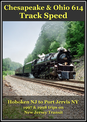 Chesapeake & Ohio 614 - Track SpeedThis DVD covers the excursions Chesapeake & Ohio #614 ran on New Jersey Transit in 1997 and 1998. It has been digitally mastered from my original VHS videotapes. Built by the Lima Locomotive Works in 1948, C&O #614 was one of the last 4-8-4 type locomotives (called Greenbriers on the C&O) constructed in the United States, and also one of the most advanced in terms of design. All roller bearing - with an enormous boiler - and the most modern steam technology, #614 is an impressive machine, especially when witnessed pounding the rails at track speed as she was built to do. If you've seen any of my #614 videos on Youtube, you know how spectacular these trips were, and how increasingly rare this type of mainline steam action is now. We see #614 pull 20+ car passenger trains unassisted at speeds up to 79mph on the former Erie Railroad mainline between Hoboken, NJ and Port Jervis, NY. This DVD features plenty of pacing (with some incredibly close shots of the locomotive) and many, many high speed runbys with unbelievable stack talk. While Mark I Video's "Return of a Thoroughbred" covered the October 1996 trips in incredible detail, seemingly little video exists of the 1997 and 1998 trips. The quality of my video isn't quite on par with the Mark I production (they had much better equipment, and I was by no means a professional at the time), but the action is unparalleled on this DVD, especially the pacing scenes on Route 17 in New York. | |